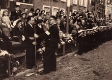 Burgemeester August PLOVIE houdt een toespraak te Bredene aan de Prinses Elisabethlaan.De jongetjes van de IBIS zijn er ook bij.