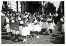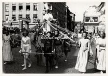 Formaat : 12 x 17 cm. - Praalwagen omringd door meisjes op het Wapenplein. Links de Louisastraat, rechtdoor de Brabantstraat.