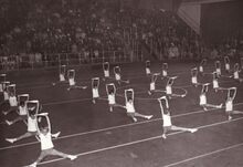 Sierlijke dames tijdens een optreden op een turnfeest in het sportcentrum aan de Koninginnelaan.