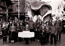 De jeugdgroep "De Blauwe Vlinders" in een stoet op het Wapenplein. Op de achtergrond de Sint- Sebastiaanstraat, en op de hoek links met de Kapellestraat, een reclameklok.