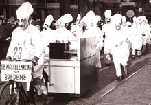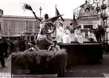 Een praalwagen met een "benne" (=mand) garnaal in een stoet op het Wapenplein.Op de achtergrond links de Brabantstraat.