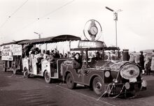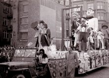 Een praalwagen met sprookjesfiguren in een carnavalstoet op het Wapenplein wordt getrokken door een Amerikaanse jeep ( reliek van de tweede wereldoorlog ?).