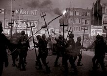 Een groep duivels tijdens een carnavalstoet op het Wapenplein. Op de achtergrond de Breidelstraat. Rechts de Kerkstraat. Reclame voor "Martini" en "Cinzano"