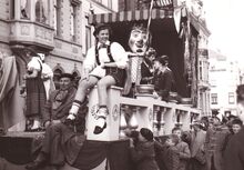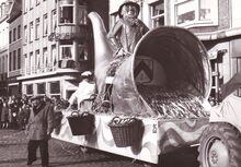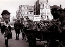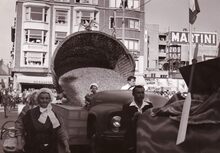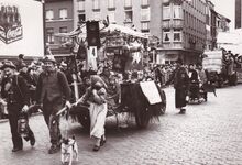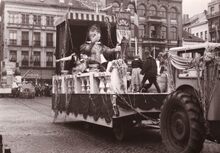 Een praalwagen uit de carnavalstooet op het Wapenplein.Rechts Adolf Buylstraat,links hoek Sint Sebastiaanstraat.