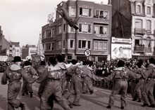 De folkloristische vereniging "De Zeebonkjes" uit Nieuwpoort in een stoet op het Marie-Joséplein,tegen de hoek met de Madridstraat.