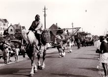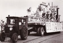 Een vrachtwagen van houthandel J.C. Claeys met praalwagen admiraalschip "Popham" bemand door leden van de "Koninklijke Maatschappij de Vereenigde Karabijnschutters" uit Bredene op het Wapenplein. Popham was een Brits genearaal die een raid uitvoerde op de sluizen te Bredene tijdens de Franse bezetting.