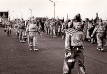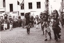 Een carnavalgroep uit de carnavalstoet op het Wapenplein .Op de achtergrond de Brabantstraat.