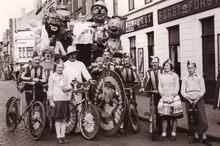 Een praalwagen uit een carnavalstoet op het Wapenplein bij de hoek Louisa- Brabantstraat.