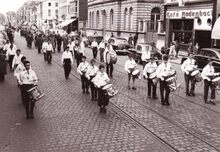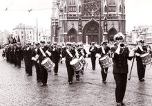 De stadsharmonie, op het Sint Petrus en Paulusplein, op weg naar een vaderlandslievende plechtigheid aan het Monument der Gesneuvelden. Op de achtergrond de Sint Petrus en Pauluskerk.