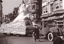 Een praalwagen in de Leopoldlaan. Op de achtergrond de zuidgevel van de Kursaal. Stoet ontworpen door Emile Bulcke.
