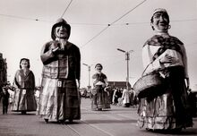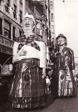 De Oostendse reuzen, vooraan Wanne en er achter Tone, in een carnavalstoet op het Marie-Joséplein aan Hotel Du Parc.