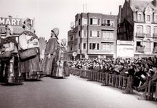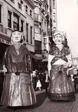 De Oostendse reuzen in een stoet op het Wapenplein, nabij de Kerkstraat (rechts).