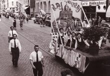 De Rerum Novarumstoet op de Alfons Pieterslaan. Rechts, "Café Rodenbach" en ernaast de Rijkswachtkazerne. Een praalwagen van de KAJ-VKAJ