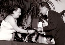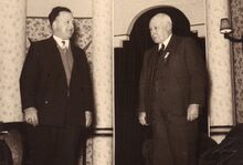 Burgemeester August PLOVIE (links) met Alfons MAES voorzitter van toneelkring "Nut en Vermaak".