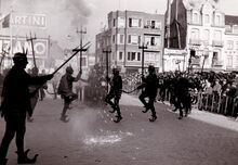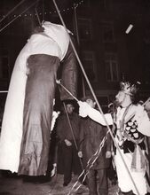 Prins Carnaval steekt de pop "Tjannie Carbong" in de fik op het Mijnplein (?) na afloop van de Cimanteirenstoet.