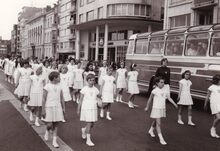 Optocht van een turnvereniging op de Vindictivelaan ter hoogte van de Christinastraat,ze hebben veel belangstelling van de passagiers van een voorbijkomende bus.