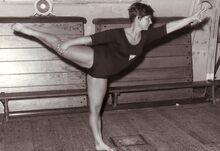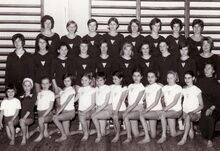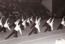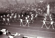 Sierlijke dames tijdens een optreden op een turnfeest in het sportcentrum aan de Koninginnelaan.