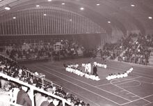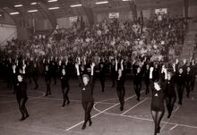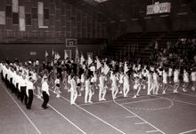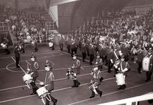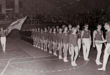 Intrede van de turners en turnsters van "Willen is Kunnen"Β in het sportcentrum aan de Koninginnelaan.