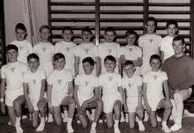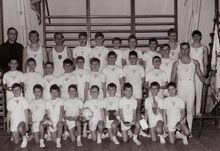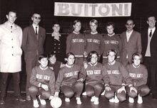 Vrouwelijke basketploeg in het sportcentrum aan de Koninginnelaan.