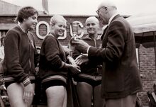 Zwemwedstijd in de vaart Oostende - Brugge aan het Sas te Bredene.Burgemeester August PLOVIE van Bredene feliciteert een winnaar.