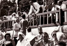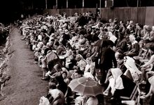 Het publiek bij een zwemwedstrijd in het Maria-Hendrikapark nabij het Koninginnehof.