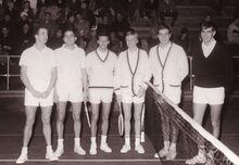 Tennissers in het sportcentrum aan de Koninginnelaan.Centraal (met bril) ....... BEUSELINCK.