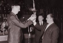 Burgemeester Jan PIERS overhandigt een trofee aan kanaalzwemmer ...... ........., in het sportcentrum aan de Koninginnelaan.