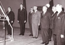 Toespraak door burgemeester Jan PIERS in het sportcentrum aan de Koninginnelaan (bij de inhuldiging ?).Links staat John LAUWEREINS,schepen ,rechts van de burgemeester Michel SURMONT,stadssecretaris en de schepenen Kamiel DEHOUCK, Raymond MIROIR en Jozef VAN DENΒ KIEBOOM. De Koninklijke Stallingen (1903). Vanaf 1959 als Sportcentrum. Beschermd monument K.B. 22/09/1981.