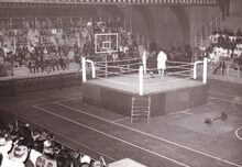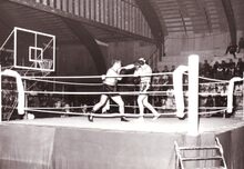 Een boksmeeting in het sportcentrum aan de Koninginnelaan.