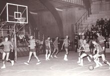 Basketwedstrijd in het sportcentrum aan de Koninginnelaan.
