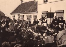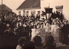 Lente - en andere maagdekens uit de inhuldigingsoptocht passeren, aan de Steense Dijk, zingend de nieuwe pastoor van Stene bij zijn aanstelling te Stene