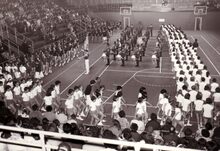 Einddefile van de deelnemers aan een turnfeest van "Willen is Kunnen" in het sportcentrum aan de Koninginnelaan.