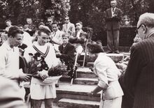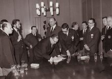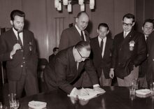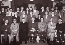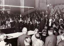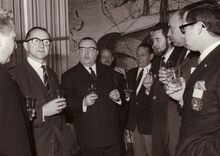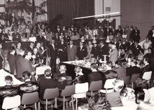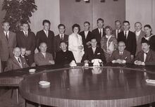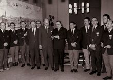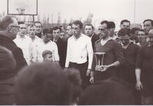 Volleybalploeg Hermes ontvangen op het stadhuis.Centraal burgemeester Jan PIERS, rechts dhr. Henri SMISSAERT en schepen Roger DE KINDER, links E.H. Jozef VERHELLE, stichter van de Hermes Uiterst links Marie-Jozef PORTA en naast hem Kamiel DEHOUCK, schepenen. Achter de burgemeester Raymond DILLEN en zijn echtgenote.