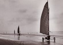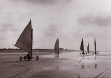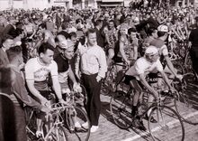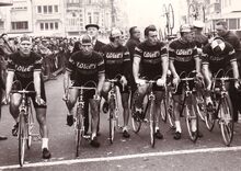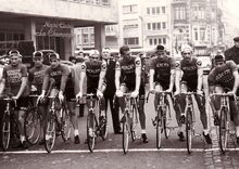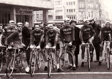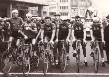 Renners van de ploegen "Verveer","Vedette" en "Mercier" voor de start van een wedstrijd aan het kursaal.