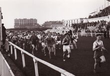 Veldloop op de Wellingtonrenbaan. Op de achtergrond de 17 Oktoberstraat met links het Buckingham hotel en rechts de "Sacre Coeur".
