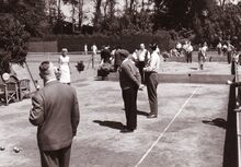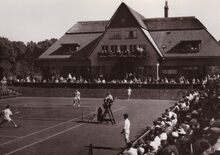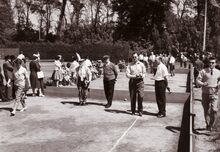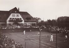 Formaat : 13 x 18 cm. - Een tennistornooi op het tenniscentrum Ostend Tennis aan de Koninginnelaan. Op de achtergrond de Leffingestraat, rechts de Prinsenlaan.