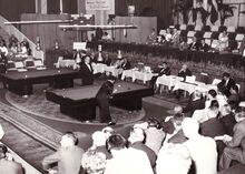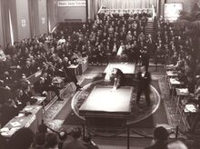 Zicht op de Ambassadeurszaal in het Casino-Kursaal Oostende tijdens het wereldkampioenschap biljart driebanden dat plaatsgreep van 23 tot 28 juni 1964. Wereldkampioen werd Raymond CEULEMANS, tweede Marcelo LOPEZ (Argentinië) en derde Roger HANOUN (Frankrijk)