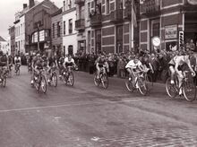 Eindsprint van een wielerwedstrijd op de Nieuwpoortse steenweg ter hoogte van de Aartshertogstraat.