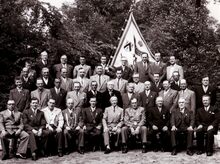 De balboogschutters de Sint Jorisgilde, met vlag in hun lokaal Café Armenonville, in het Maria-Hendrikapark bij de viering van het 110 jarig bestaan van de vereniging. Zittend tweede van links, Laurent Soenen en vierde van rechts op de vierde rij, Louis Deknock.