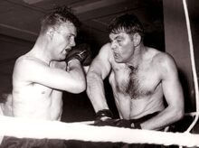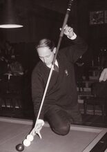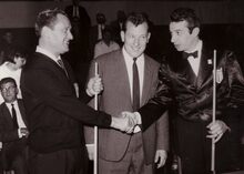 Twee deelnemers aan een biljarttornooi in het kursaal (of in het Achturenhuis ?).Tussen hen Raymond CEULEMANS,meervoudig wereldkampioen biljarten.