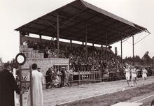 Het Hermesathletiekstadion tijdens een meeting. Zicht op de tribune.