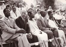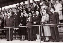 Formaat : 13 x 18 cm. - Tennistornooi in het tenniscentrum Ostend Tennis aan de Koninginnelaan. De tribune met de Mwami van Rwanda (tweede van rechts), en zijn gezelschap. Op de achtergrond de Prinsenlaan.