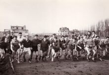 Een ploeg van Hermes wordt ontvangen door het stadsbestuur. Zittend links, Maria-Jozef Porta, schepen. Centraal met sjerp Maurice Quaghebeur, schepen en links van hem, Jozef Verhelle, stichter van de Hermes. Tweede van rechts, Kamiel Dehouck, schepen.