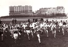 Veldloop Hermes op de Wellington renbaan aande grote tribune.Op de achtergrond de 17 oktoberstraat met links het Buckingham hotel en rechts de "Sacre Coeur" de huidige Katholieke Industriële Hogeschool.
