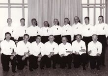 De senioren van turnvereniging OTV Noordzee voor (of na) een optreden in het kursaal. Achteraan links, Maurice Vandecasteele