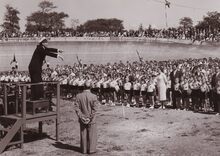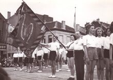 Overhandiging van het nieuw vaandel van voetbalploeg "Hoger Op Oostende" op het terrein van KVGO voetbal. Links de thans verdwenen watertoren.
