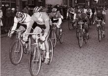 Een groep wielrenners op de Torhoutsesteenweg nabij het kruispunt Petit Paris. Achter hen een stadstram.
