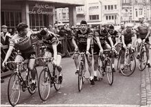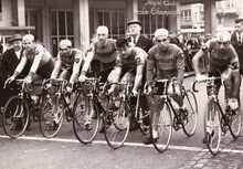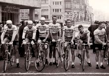 Wielerploeg "Peugeot" voor de start van een wedstrijd aan het kursaal.Rechts Pino CERAMI.
