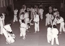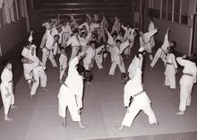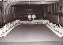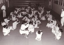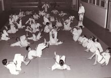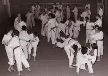 Oefenen in vallen door toekomstige judoka's in het sportcentrum.Rechts staat Hubert LAUWERS die les geeft.