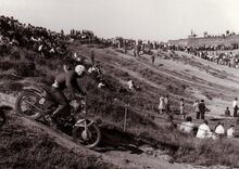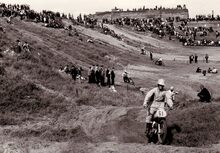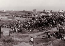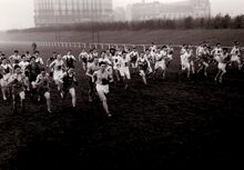 Veldloop op de Wellington renbaan.Op de achtergrond de 17 oktoberstraat met de Katholieke Industriele Hogeschool (rechts) of de "Sacre Coeur" en het Buckingham Hotel.